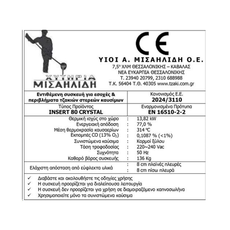 Χυτήρια Μισαηλίδης T-80 Crystal Ενεργειακό Τζάκι Κασέτα Ξύλου 13,8kW Ίσιο με Ανοιγόμενη Πόρτα